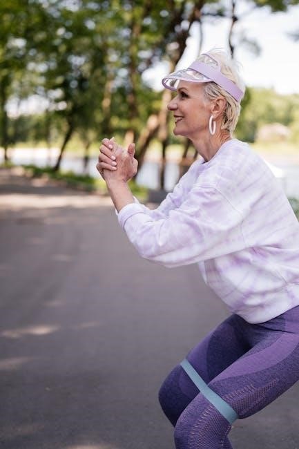 These PDF guides often demonstrate maintaining a slight bend in the knees and keeping the back straight during the exercise. Small, controlled steps are emphasized to maintain tension on the band.
